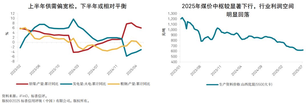 我们预计,2025年下半年迎峰度夏和采暖季等因素或将支撑煤炭需求,供给增速较上半年回落,行业供需格局相对平衡。需求方面,2025年1-5月,受全社会用电量增长较为温和以及新能源发电量快速增长的影响,火电发电量累计同比下降3.1%;粗钢产量同比下降1.7%。我们预计2025年全社会用电量将保持健康增长,其中下半年火电需求有望在高温天气和采暖季等因素推动下获得一定支撑,从而提振动力煤需求,而焦煤需求仍将受到钢铁行业需求疲软的制约。供给方面,2025年上半年煤炭供给偏宽松,1-5月全国原煤产量累计同比增长6.0%,山西、陕西、内蒙古、新疆四大煤炭产区产量同比增速分别为13.6%、3.1%、0.9%和9.8%,其中山西增速较快主要系上年"三超"治理导致的低基数效应。我们认为,在山西产能逐步恢复的基础上,其他主产区的生产仍将保持惯性增长,特别是新疆煤炭在成本优势和政策支持下仍将维持较快增速,但受价格、利润和安监治超等因素影响行业供给增速将较上半年回落,2025年国内煤炭产量将保持小幅增长。